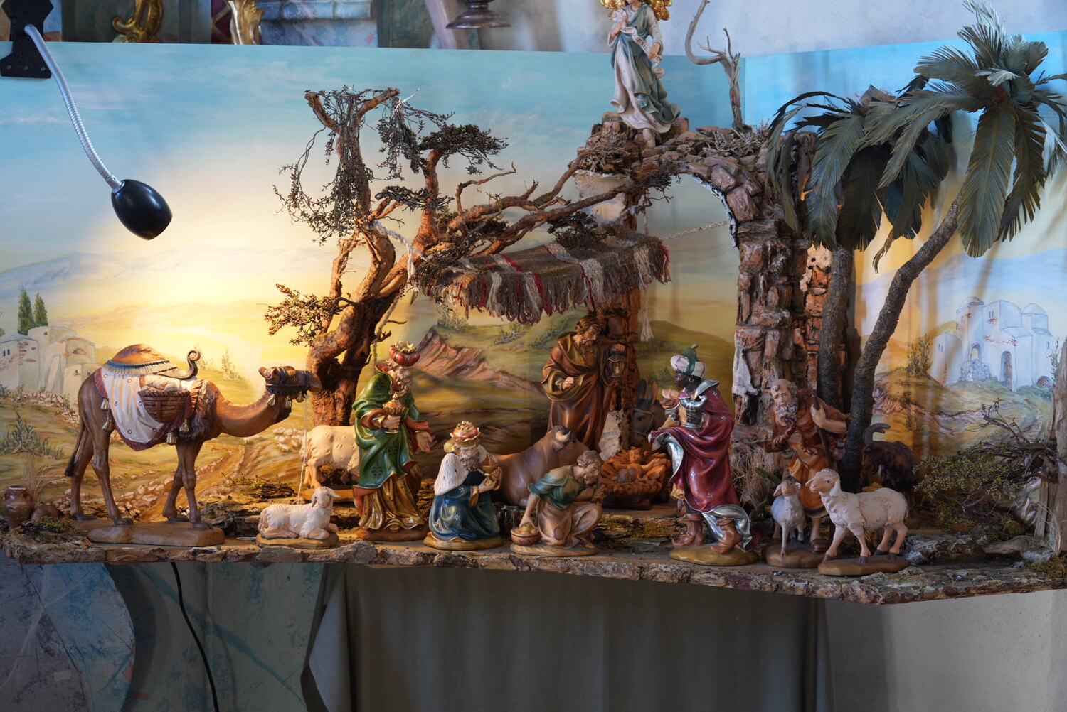 Im Montag-Nachmittag Baukurs des Krippenvereines Lustenau hat Hubert diese orientalische Krippe gebaut. Es waren dafür ca. 60-70 Stunden notwendig. Sein Freund und Kurslehrer Otmar Holzer hat zu dieser Krippe einen zweiteiligen Hintergrund gemalt.